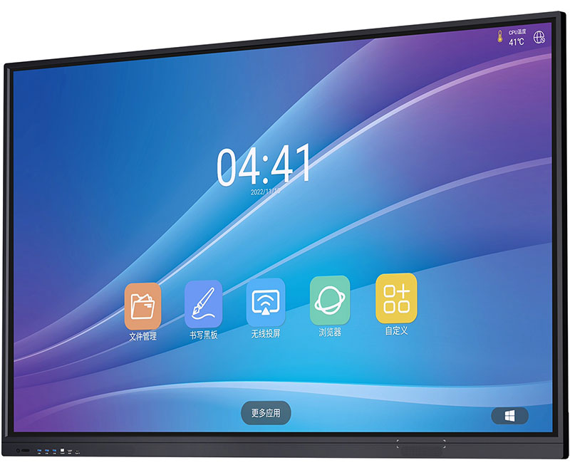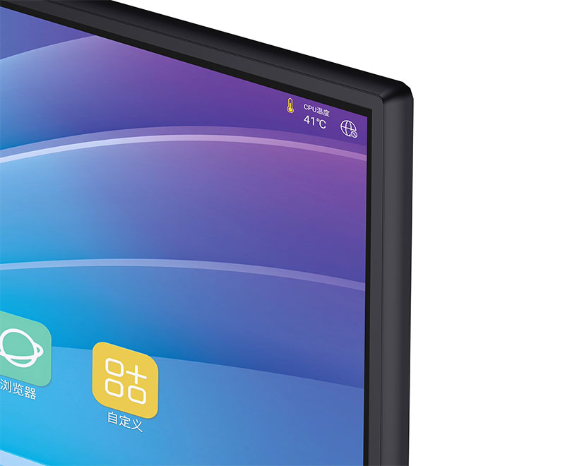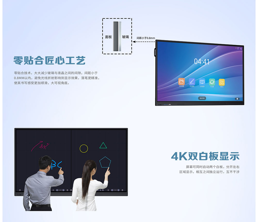 4K书写白板,书写笔迹4K超高清分辨率,笔画细腻; 高性能书写软件,支持单点、多点书写,增加笔锋书写效果等,支持白板插入图片,加页,手势板檫,放大,缩小及漫游、扫码分享,任意通道任何界面下可进行批注等功能;白板页面无极缩放,可随意撤销和恢复,不限步数; AG 防炫光钢化玻璃,莫氏 7 级硬度,安全有保障,书写体验更佳;